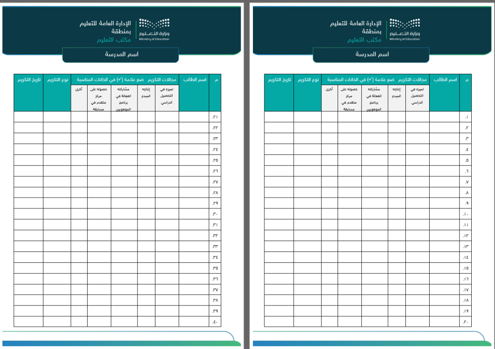 يُعد التحفيز والتكريم أحد الأساليب التربوية الفعّالة التي تسهم في تعزيز السلوك الإيجابي، ورفع دافعية المتعلمين والمعلمين والعاملين نحو التميز والإنجاز. ومن هذا المنطلق، حرصت المدرسة على إنشاء سجل خاص يوثق جهود ومبادرات أفراد المجتمع المدرسي في مختلف المجالات، ويبرز نماذج مشرّفة يُحتذى بها، سعيًا لغرس ثقافة التقدير وتعزيز بيئة مدرسية محفّزة تسودها روح الإيجابية والانتماء.