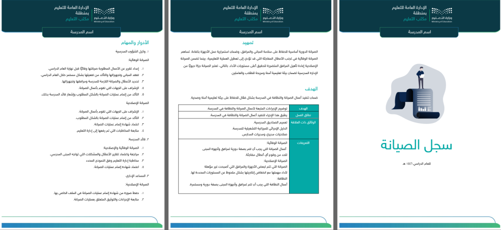 يُعد سجل الصيانة أحد السجلات الإدارية الأساسية التي تُستخدم لتوثيق جميع أعمال الصيانة المنفذة داخل المدرسة، سواء كانت صيانة دورية أو طارئة. يهدف هذا السجل إلى متابعة الحالة العامة للمباني والمرافق والتجهيزات المدرسية وضمان استمرارية عملها بكفاءة، بالإضافة إلى رصد البلاغات ومواعيد تنفيذ أعمال الصيانة والجهات المنفذة لها