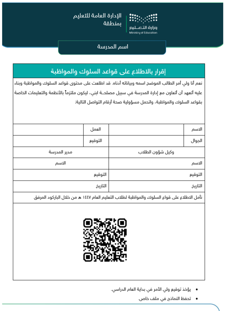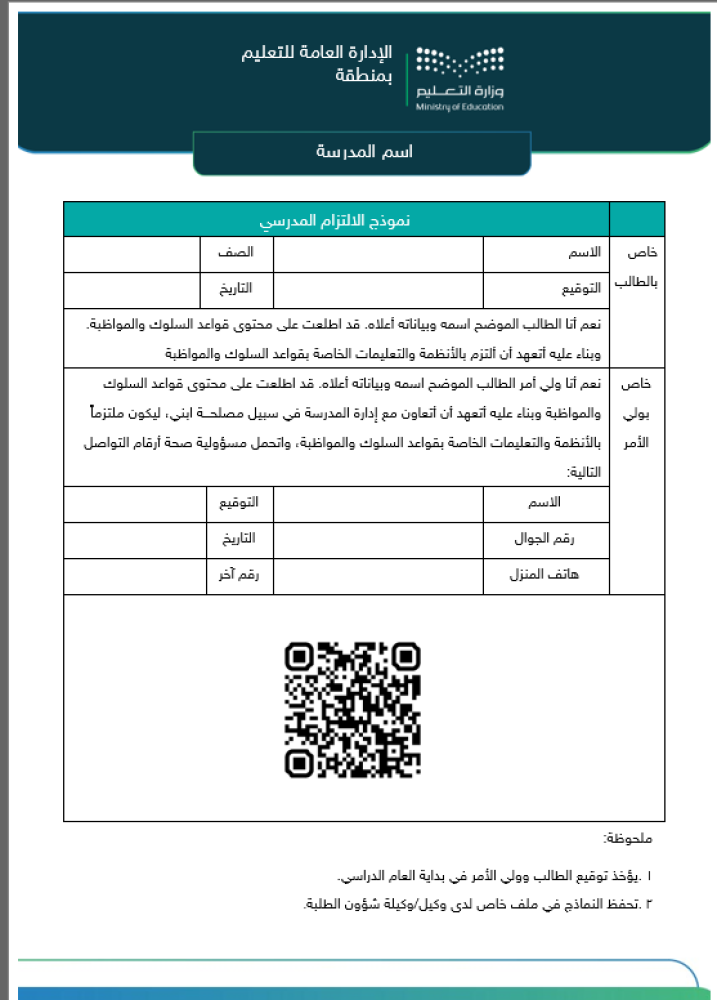 نموذج الإلتزام المدرسي وفق قواعد السلوك والمواظبة 1447ه