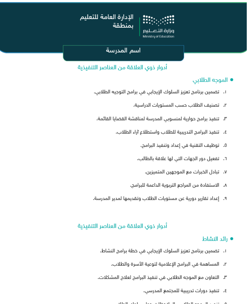 • وضوح الأدوار عبر تحديد مهام المدير، الموجه الطلابي، والأسرة لتكامل الجهود.