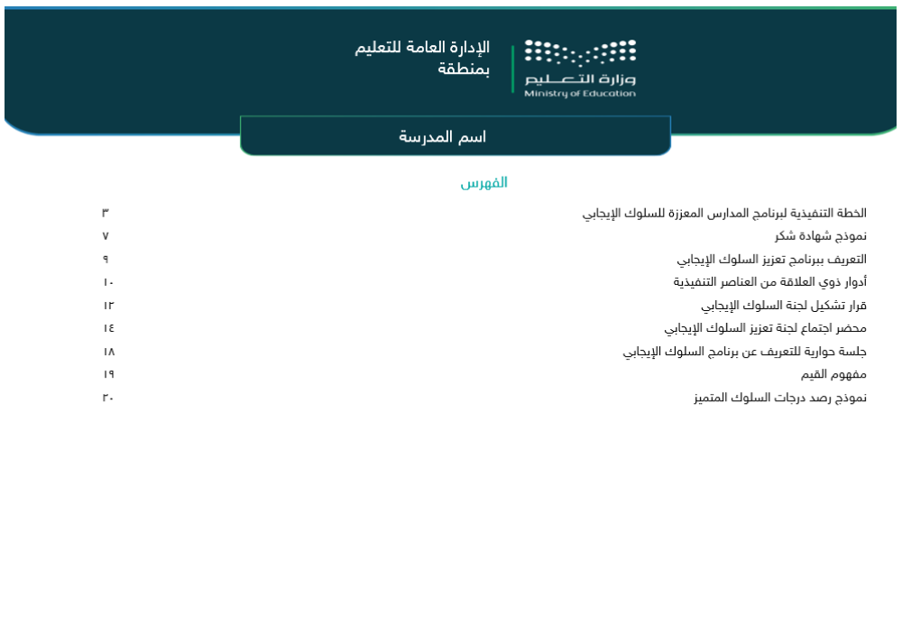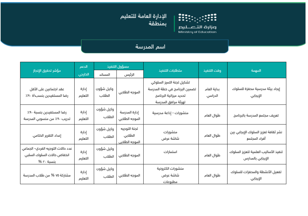1. الخطة التنفيذية لبرنامج المدارس المعززة للسلوك الإيجابي.