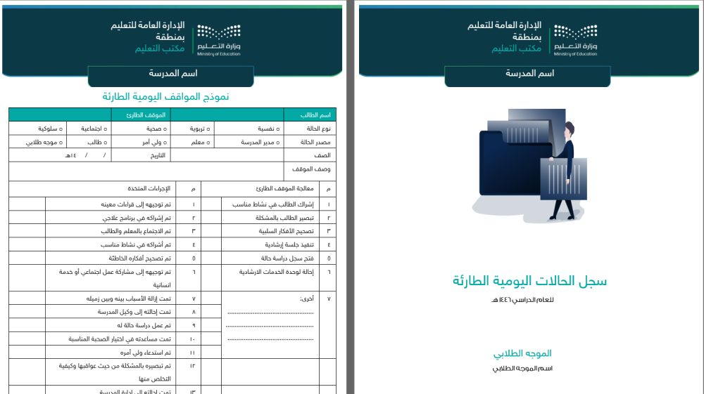 سجل متابعة الحالات الطارئة المصمم لطلاب رياض الأطفال هو أداة توثيقية وتنظيمية تهدف إلى تسجيل ومراقبة جميع الحالات الطارئة التي قد تحدث أثناء اليوم الدراسي. يتم تصميم السجل ليكون بسيطًا ومباشرًا، مع التركيز على توفير المعلومات الأساسية التي تضمن التدخل السريع والفعال في الحالات الطارئة.