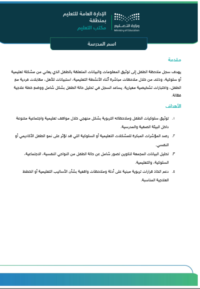 يهدف سجل ملاحظة الطفل إلى توثيق المعلومات والبيانات المتعلقة بالطفل الذي يعاني من مشكلة تعليمية أو سلوكية، وذلك من خلال ملاحظات مباشرة أثناء الأنشطة التعليمية، استبيانات للأهل، مقابلات فردية مع الطفل، واختبارات تشخيصية معيارية. يساعد السجل في تحليل حالة الطفل بشكل شامل ووضع خطة علاجية فعّالة.