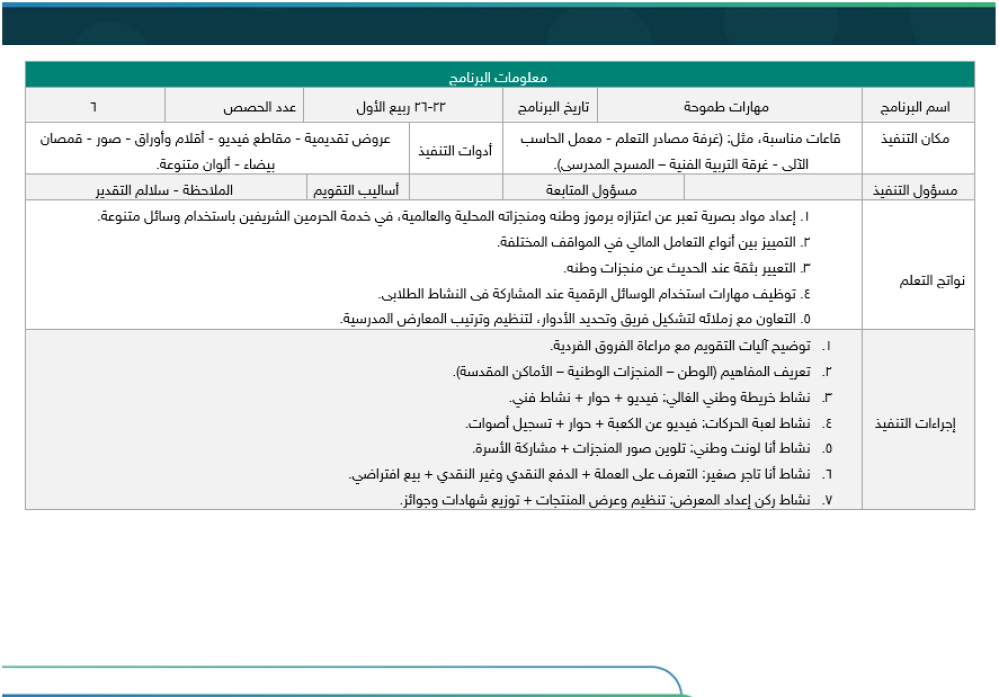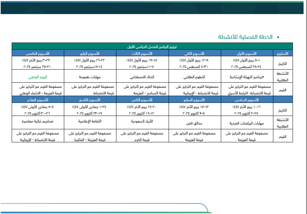 يحتوي المنتج على الخطة الفصلية للبرامج والأنشطة الطلابية موزعة على الأسابيع الدراسية حسب المجالات
