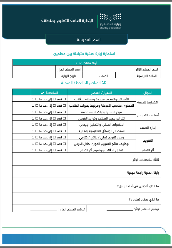 تُعد هذه الاستمارة من الأدوات المعتمدة في خطط التطوير المهني داخل المدرسة حيث تتيح للمعلم توثيق الملاحظات التربوية أثناء حضور حصة زميله وتقديم تغذية راجعة بناءة تعزز من جودة التعليم وتدعم النمو المهني المستمر.
