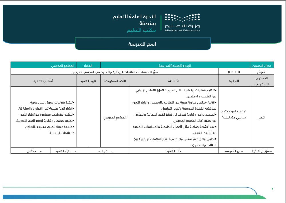 - خطة شاملة ومتكاملة تتضمن مبادرات وأنشطة مدروسة لتحسين الأداء في جميع مجالات ومعايير التقويم المدرسي.