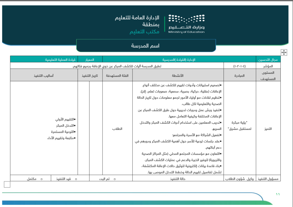 - فترة التنفيذ وجدولة زمنية واضحة ( يسجل التاريخ حسب وضع المدرسة)