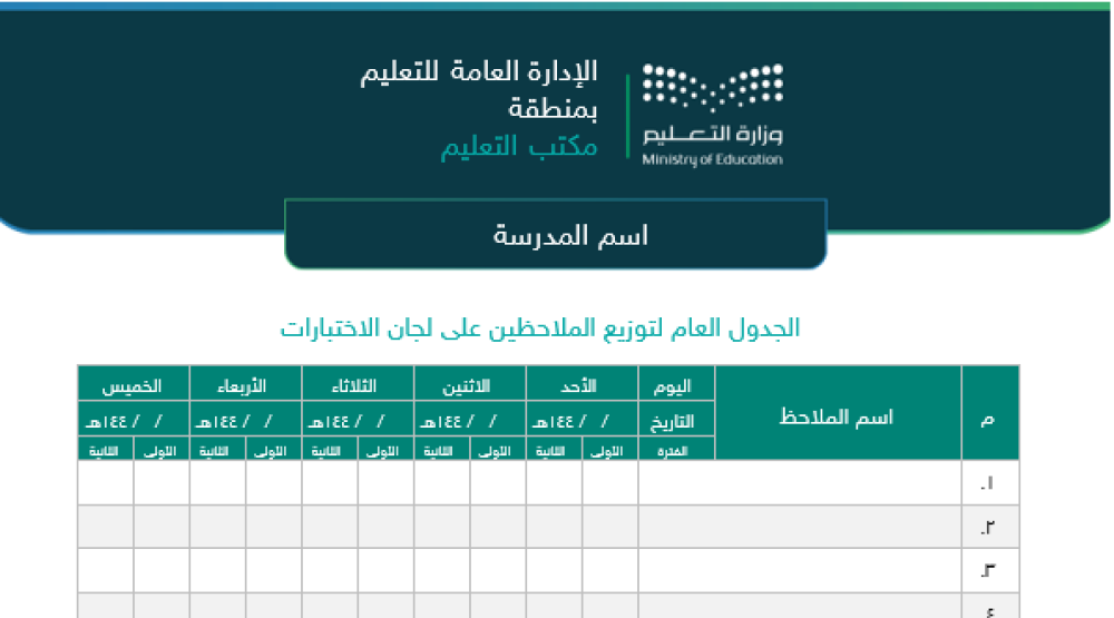 الجدول العام لتوزيع الملاحظين على لجان الاختبارات